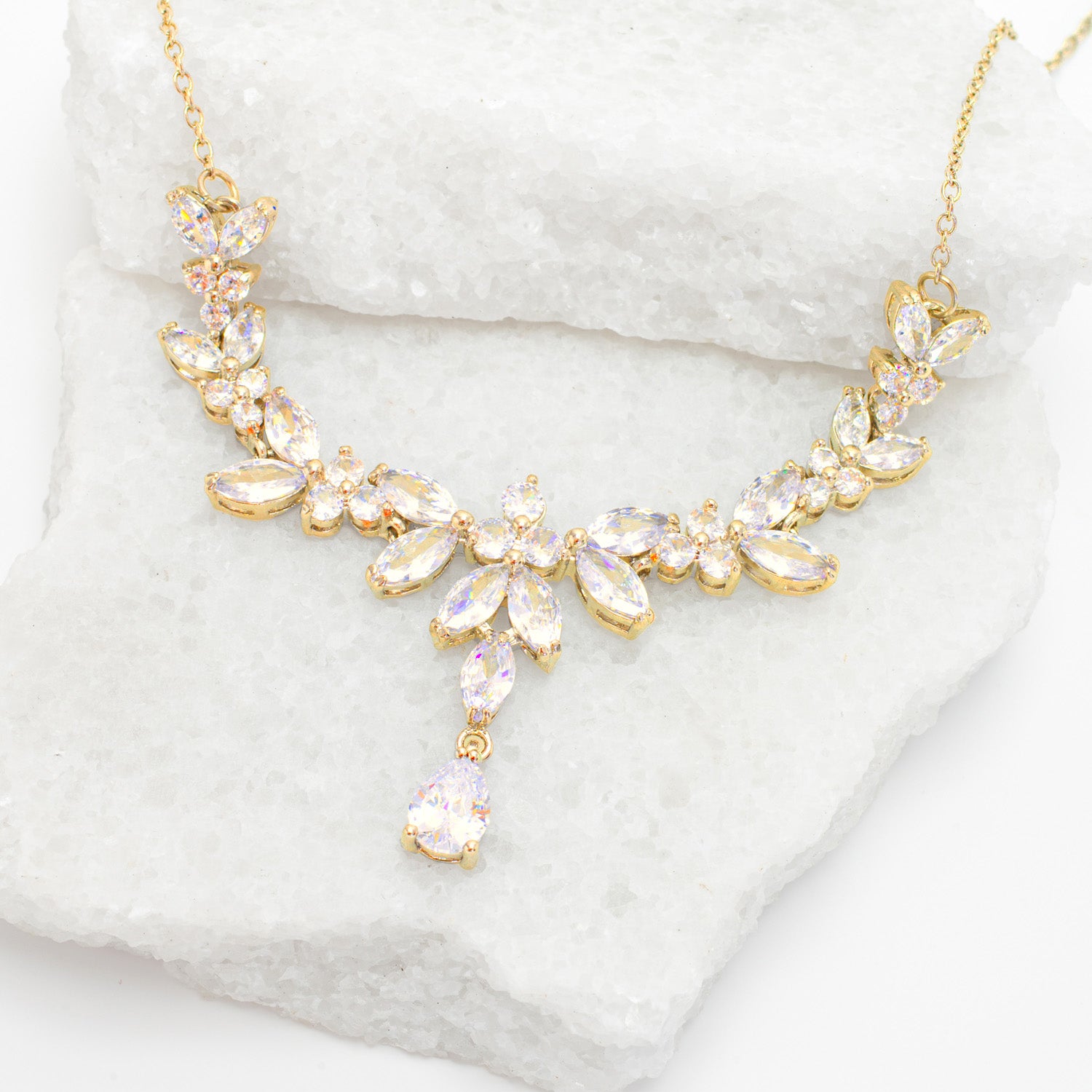 Whether you're a bride walking down the aisle, a bridesmaid adding a touch of sophistication, or attending a special event, these earrings elevate your style and make a statement of refined elegance and style. The Golden Chandelier Necklace symbolizes the joy of celebration and the beauty found in every cherished moment. Let this gorgeous necklace serve as a reminder that life is meant to be adorned with moments of sparkle and grandeur.