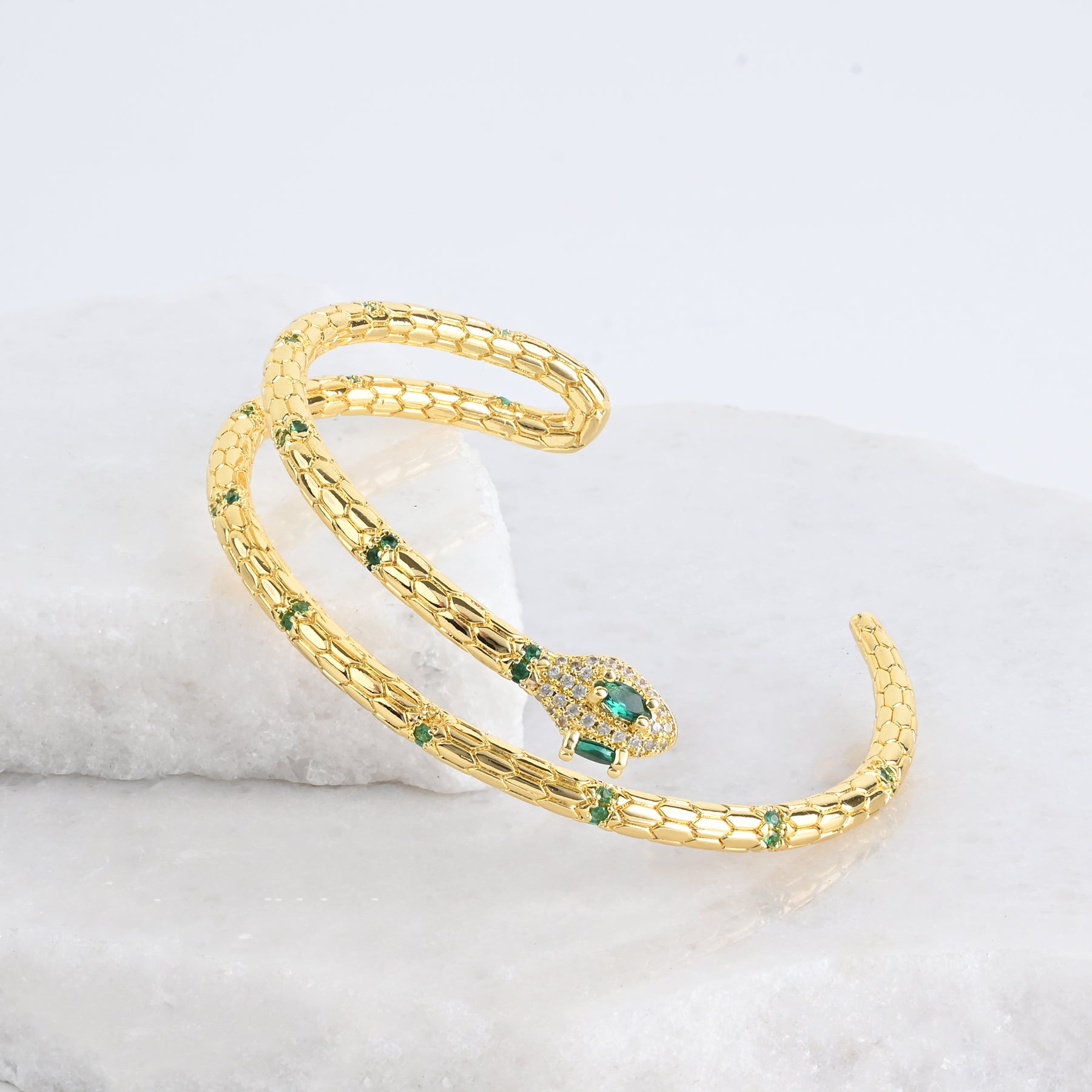 Unleash the elegance of the Little Dragon Cuff Bracelet. This bold, 18K gold plated cuff is encrusted with shimmering zircon stones and designed to wrap gracefully around the wrist, creating a striking, sculptural silhouette. Inspired by the strength and resilience of the snake, the bracelet is adorned with eye-catching emerald green crystal accents that sparkle along its entire length. As 2025 marks the Lunar Year of the Snake, also known as the "Little Dragon," this bracelet symbolizes transformation, renewal, and the courage to grow. Wear or gift this bracelet as a powerful reminder of change and the hope your purchase helps provide.
