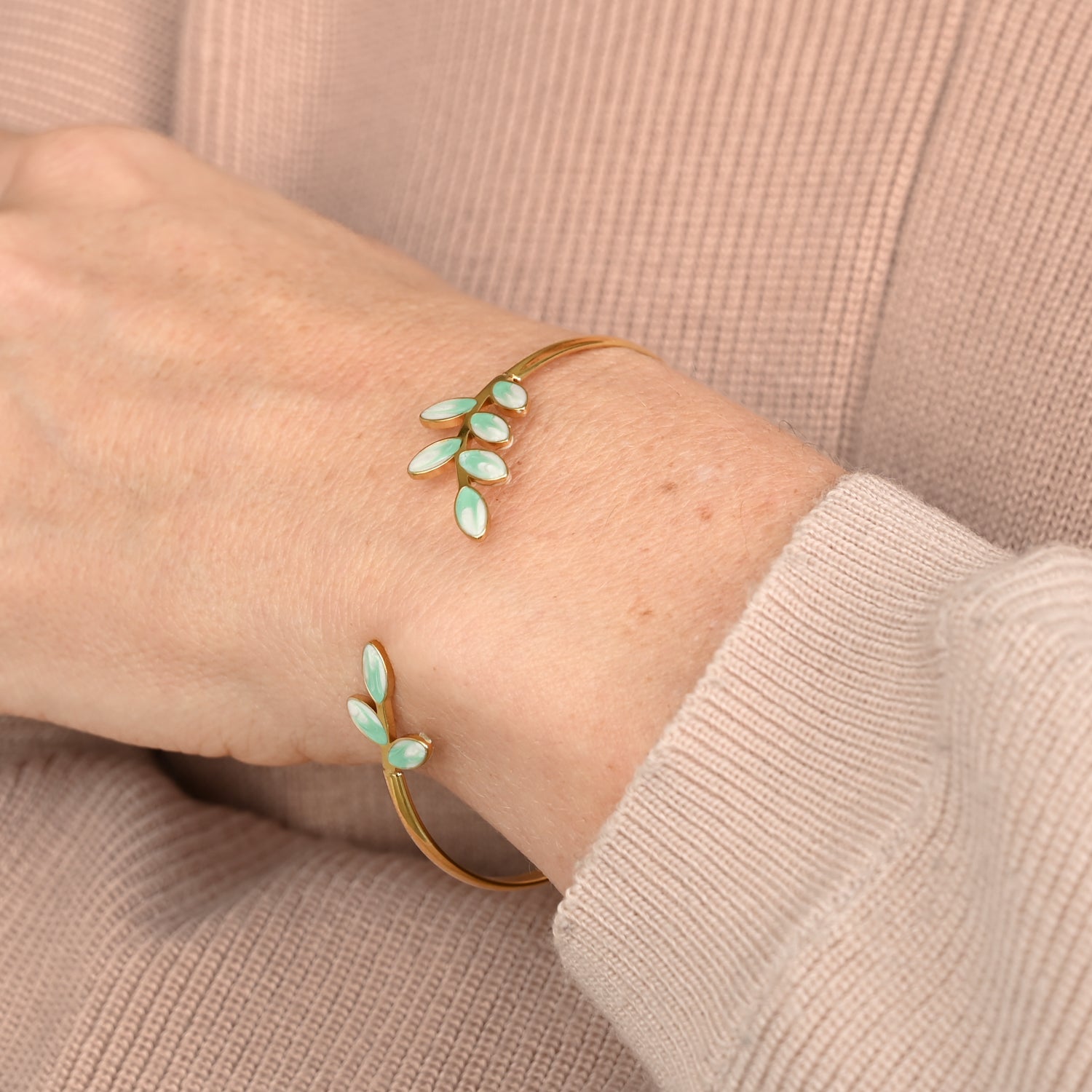 The Hope Grows Cuff tells a story of connection, strength, and resilience. Accented with soft brushed enamel, two leaves meet at the center—symbolising growth, unity, and hope taking root. With its open cuff design, this piece offers a comfortable, adjustable fit and makes a meaningful gift or personal reminder of life’s continual unfolding. Every Hope Grows Cuff supports survivors on their journey toward freedom and brighter futures, making each wear a reflection of beauty with purpose.