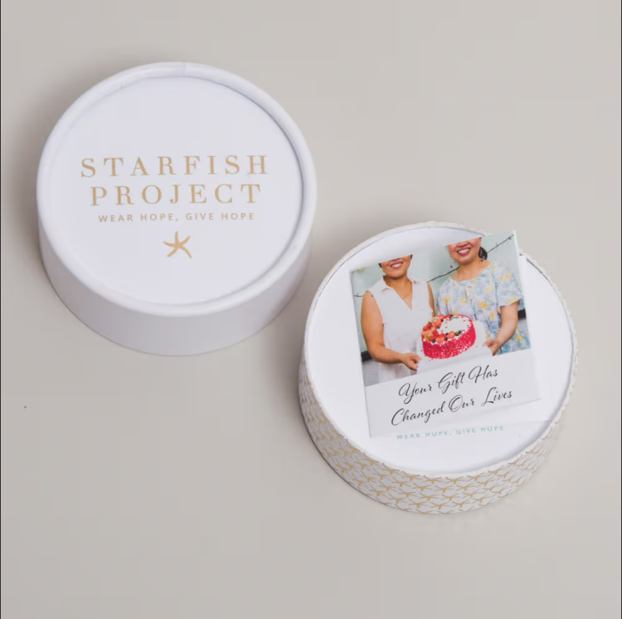 珍珠母貝與 14K 金鍍層的結合,訴說著海星計畫中女性所經歷的恢復,以及她們看到仍受剝削的女性獲得自由的心聲。在這條雙面項鍊的另一面,我們刻有「希望」一詞。我們希望,當我們遇到的女性收到這份美麗的禮物時,她們將對擺脫剝削的生活抱有新的希望。