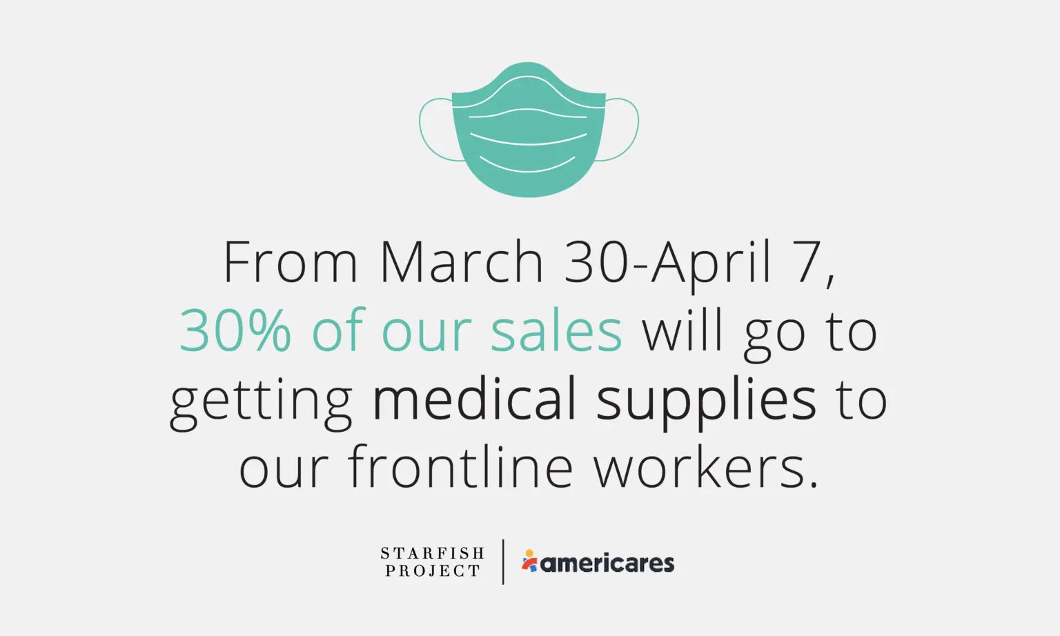 我們誠摯邀請您加入我們,透過與 Americares 的合作,我們的影響力將加倍。截至 4 月 7 日,我們所有銷售額的 30% 將用於為每天與 COVID-19 作鬥爭的美國第一線工作人員購買醫療用品。