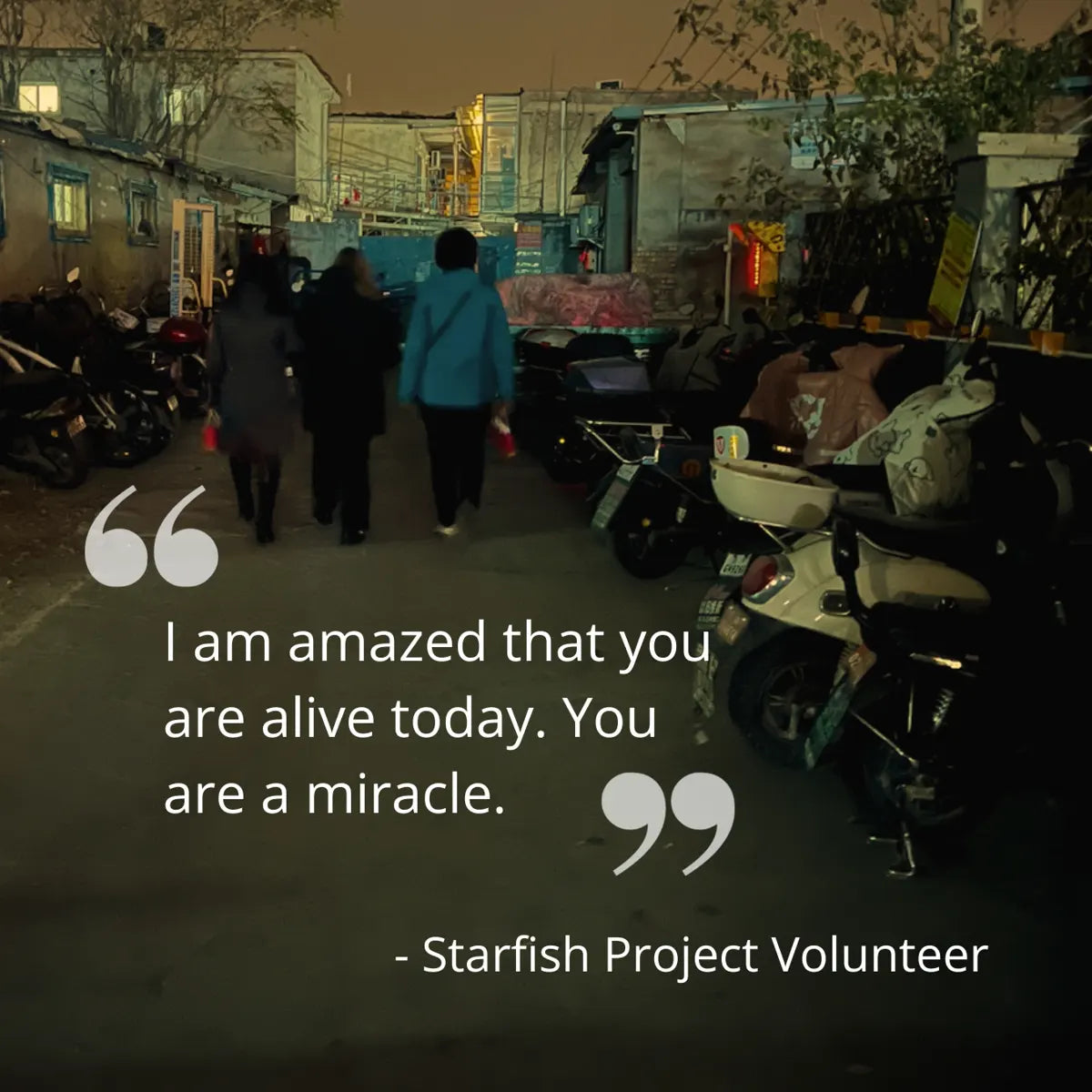 我從 14 年前開始參與海星,當時我還是個帶著幼兒的全職媽媽。我受邀與一名外展人員一起去妓院參觀。一天傍晚,我背著嬰兒背帶裡的兒子,騎上自行車前往幾英里外的一個城中村。我和外展人員走進一家妓院並開始聊天。那天,我找到了一個新朋友,欣欣,一個懷孕7個月的女人,她正在以她唯一知道的方式努力生存。