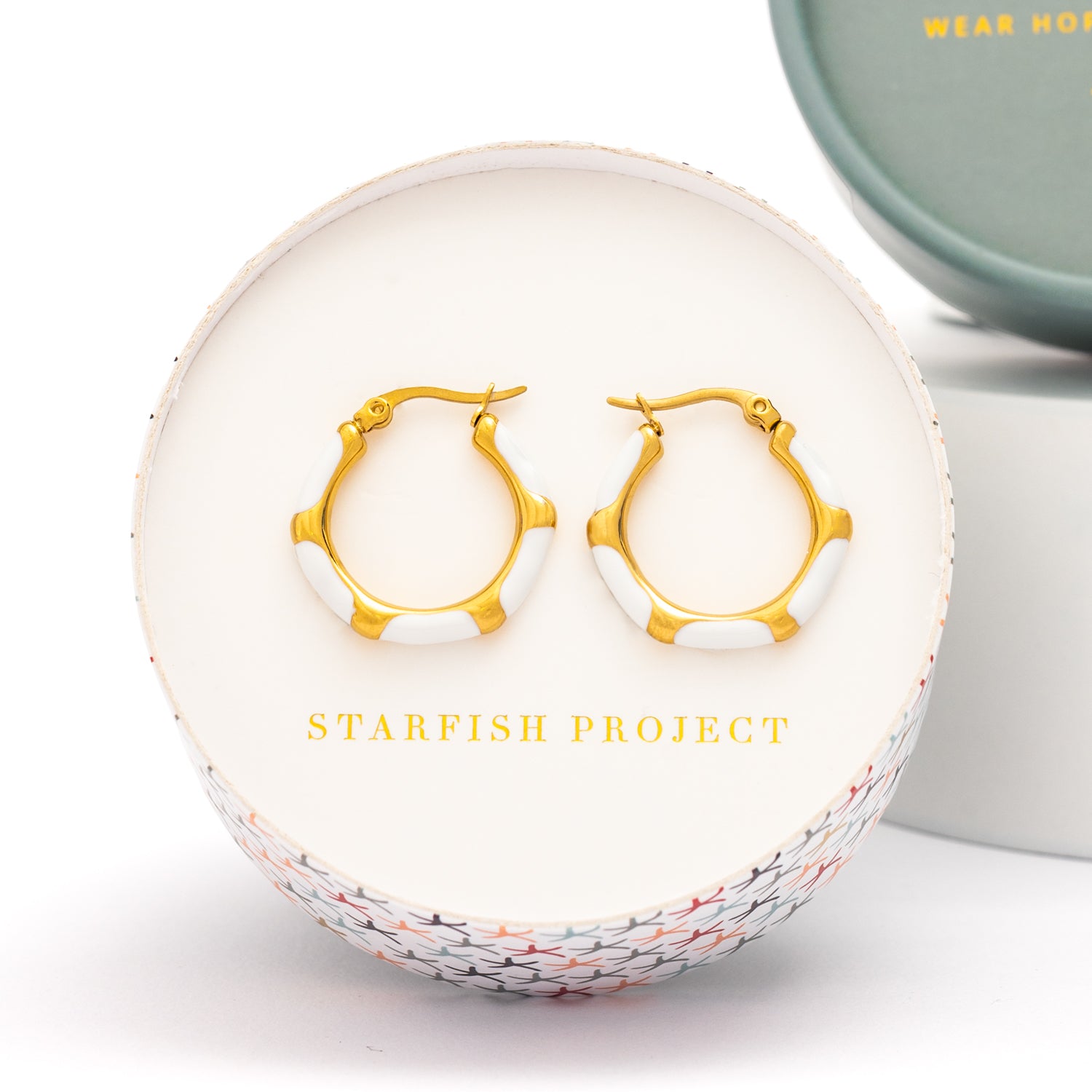 告別經典的金環耳環,用我們的象牙白和金色琺瑯環狀耳環為您的收藏增添一抹亮白。這對尺寸適中的14K鍍金琺瑯耳環,可為您的各種場合增添光彩,從職場到休閒週末,都能完美搭配。無論您是想送禮還是犒勞自己,購買象牙白和金色環狀耳環,都能幫助女性擺脫剝削,開啟自由自在、可持續的珠寶創作和攝影新生活。感謝您用心購買,用心呵護!