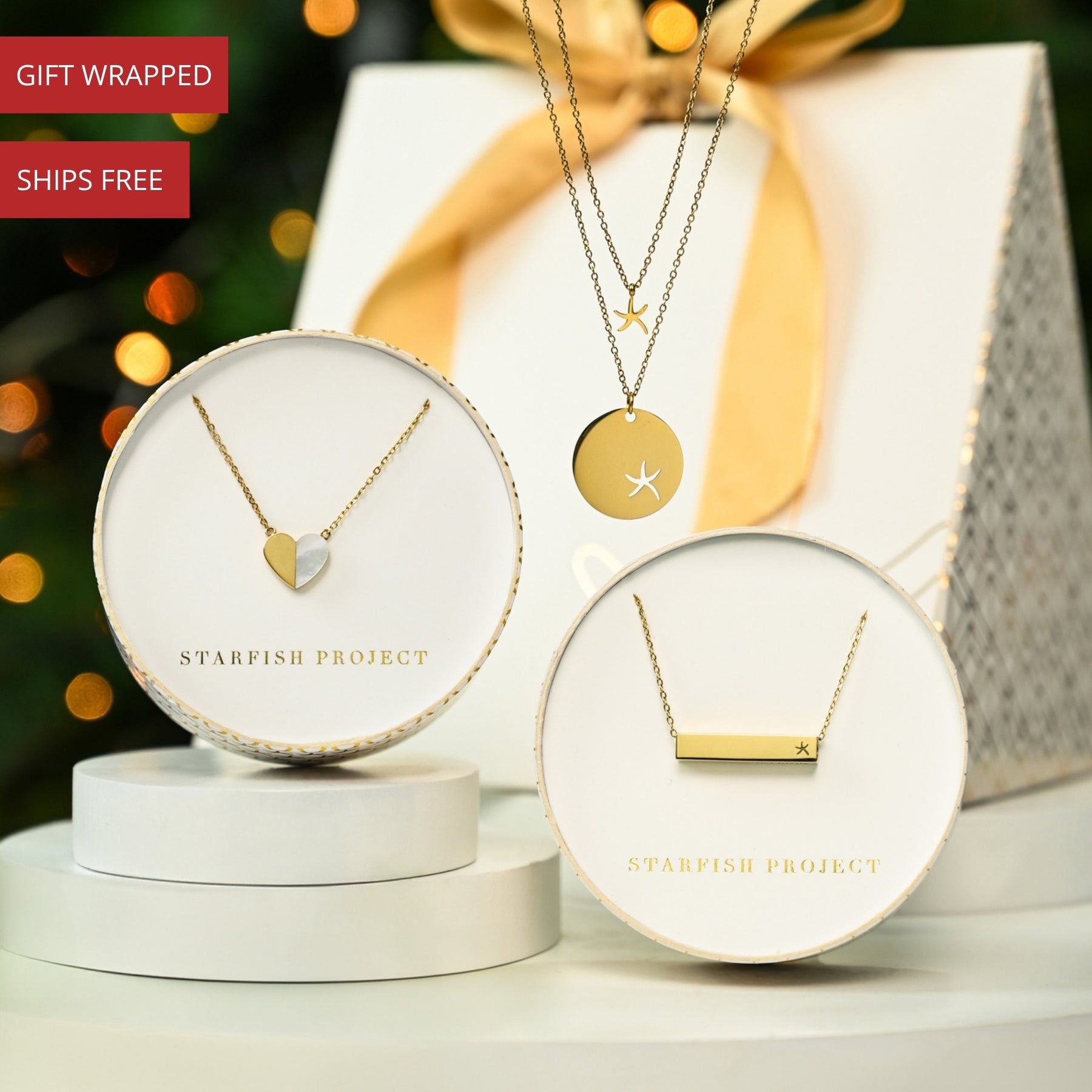 您購買的產品將採用我們標誌性的 Starfish Project 包裝,並附有幫助創建該產品的女性親筆簽名的貼紙或卡片。您的珠寶首飾的風格和尺寸決定了海星項目包裝盒的尺寸和形狀。您所購買的產品在送達時也不會在珠寶盒或包裝單上列出價格。